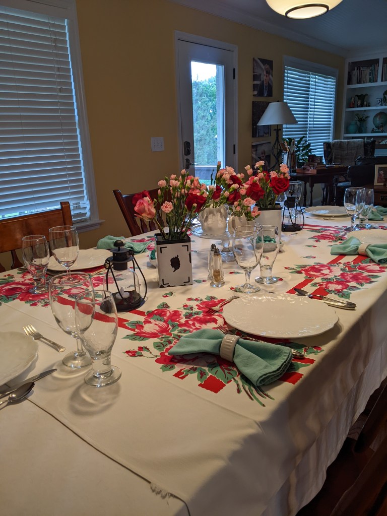 Place settings are white Villeroy and Boch dinner plates, Daffodil Independence fruit bowls (thrifted), water goblets (thrifted), wine glasses, flatware, and navy napkins (thrifted)–I should have used my green glass napkin rings (estate sale), but didn’t think of those.