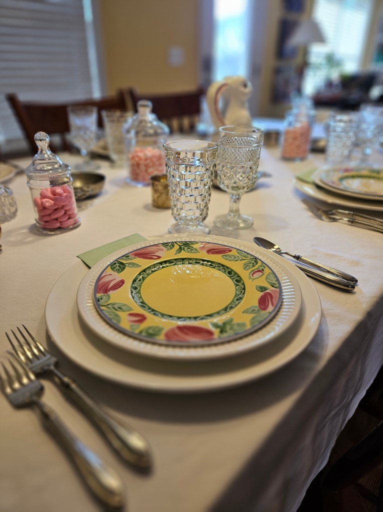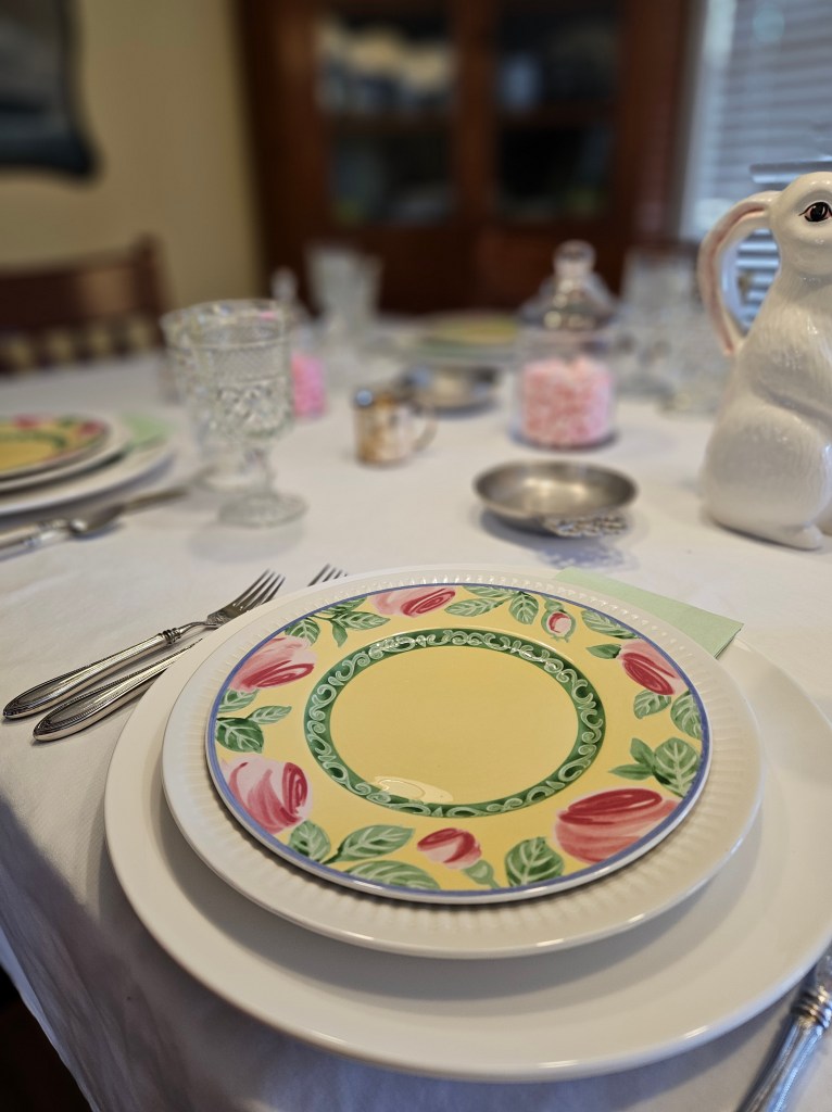 I used some of my extensive collection of small white creamer pitchers for the flowers along with a bunny pitcher made by Bordallo Pinheiro. I love white pitchers because you can use them so many ways and when they are small like this, it doesn’t take many flowers to fill them. (I probably have 20 of them and have picked all of them up for $1 to $5.) I have enough that I could use them as placecards–I’ll have to do that.