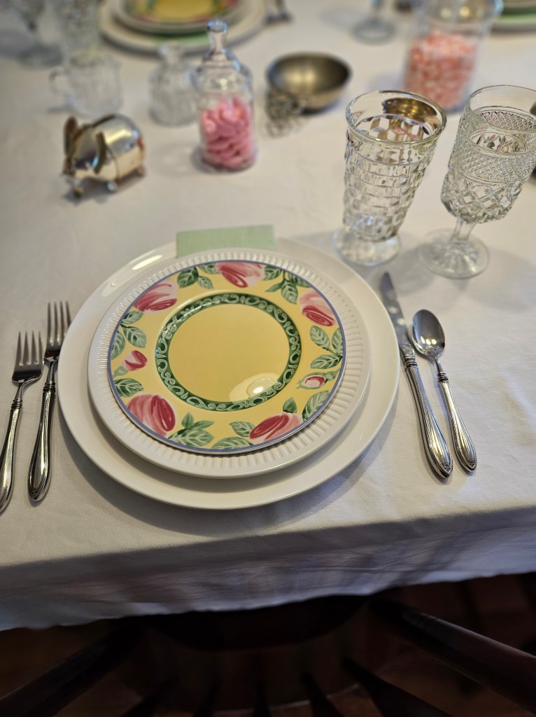 I have found in doing these tables, that I have very little in the way of pink anything to do tablescapes. I found these gorgeous Villeroy and Boch Summerhouse Rose salad plates for a great price on ebay, so I got them. (If you haven’t guessed, Villeroy and Boch is my very favorite maker–high quality, dishwasher safe, and great patterns.) Here’s what I came up with: