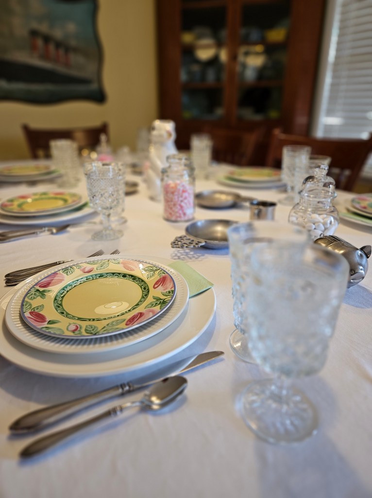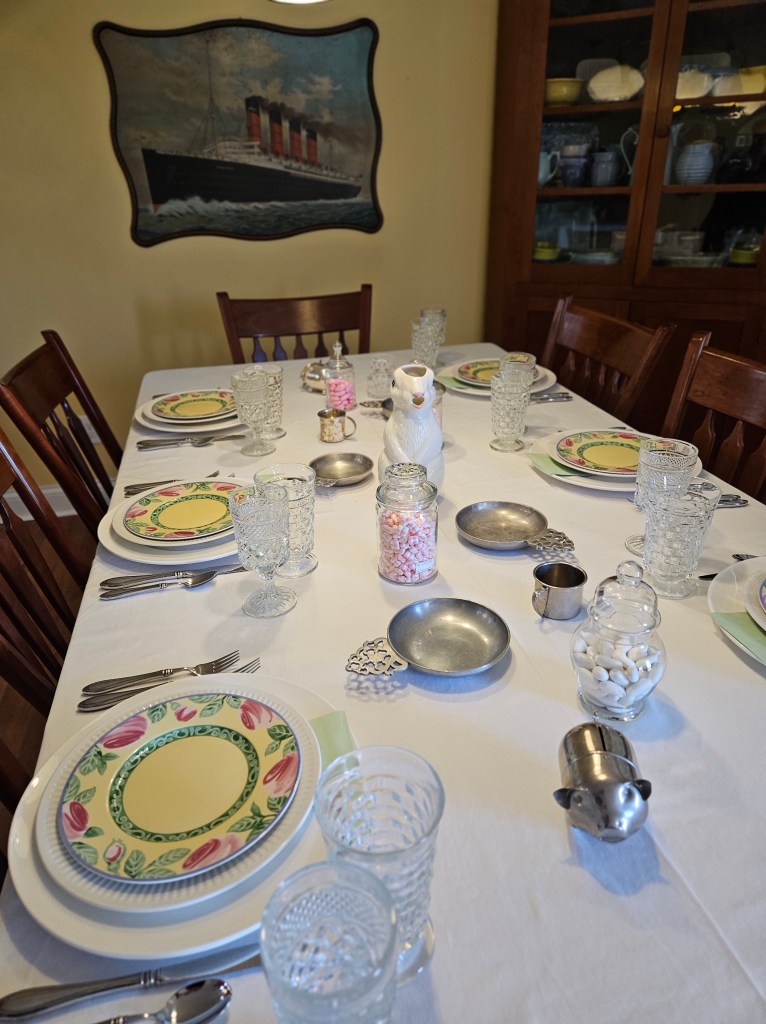 I reused the items from the Easter table, and added a bunny pitcher, some baby cups, pewter porringers, and some metal banks–a pig and an elephant.