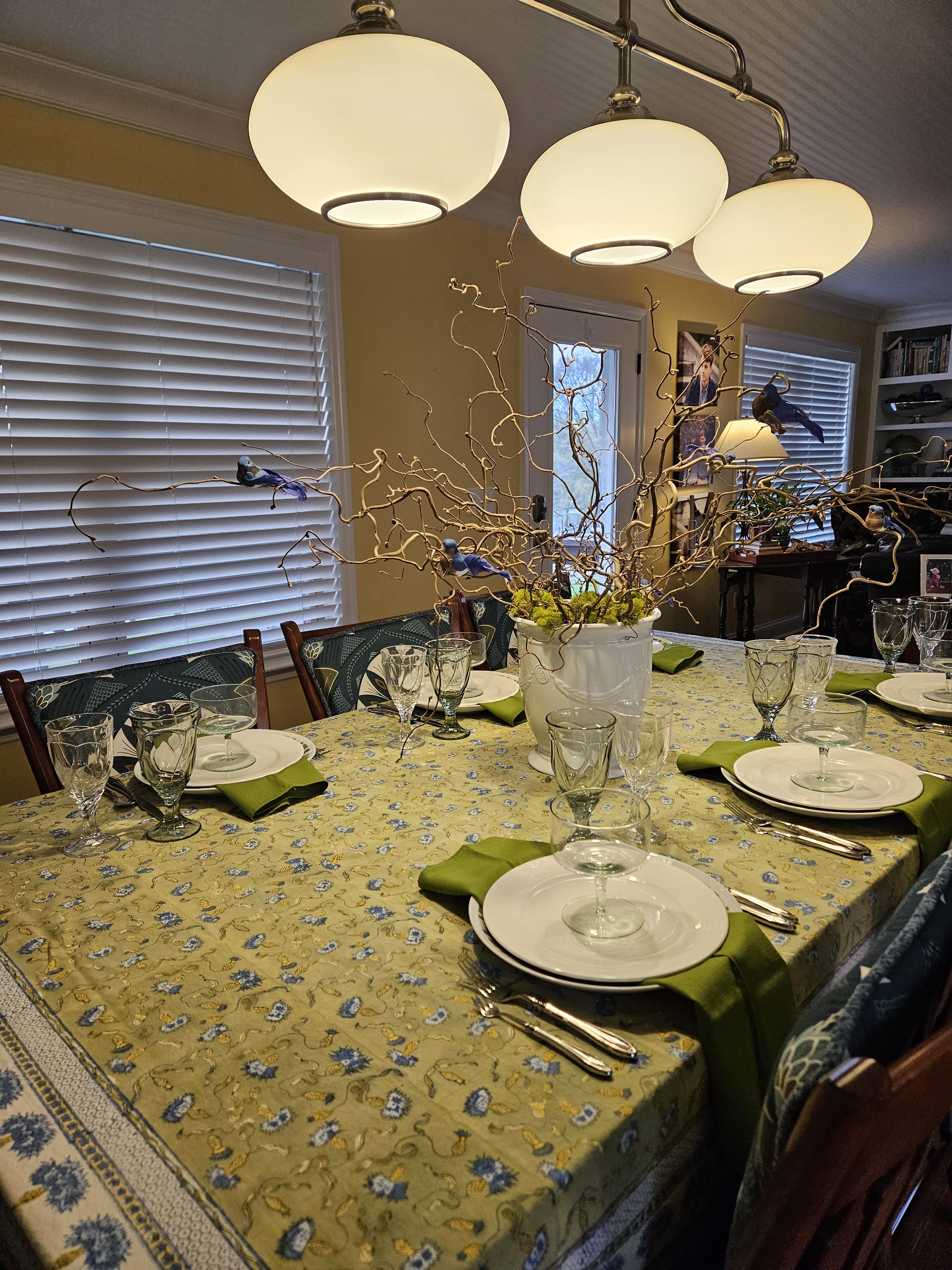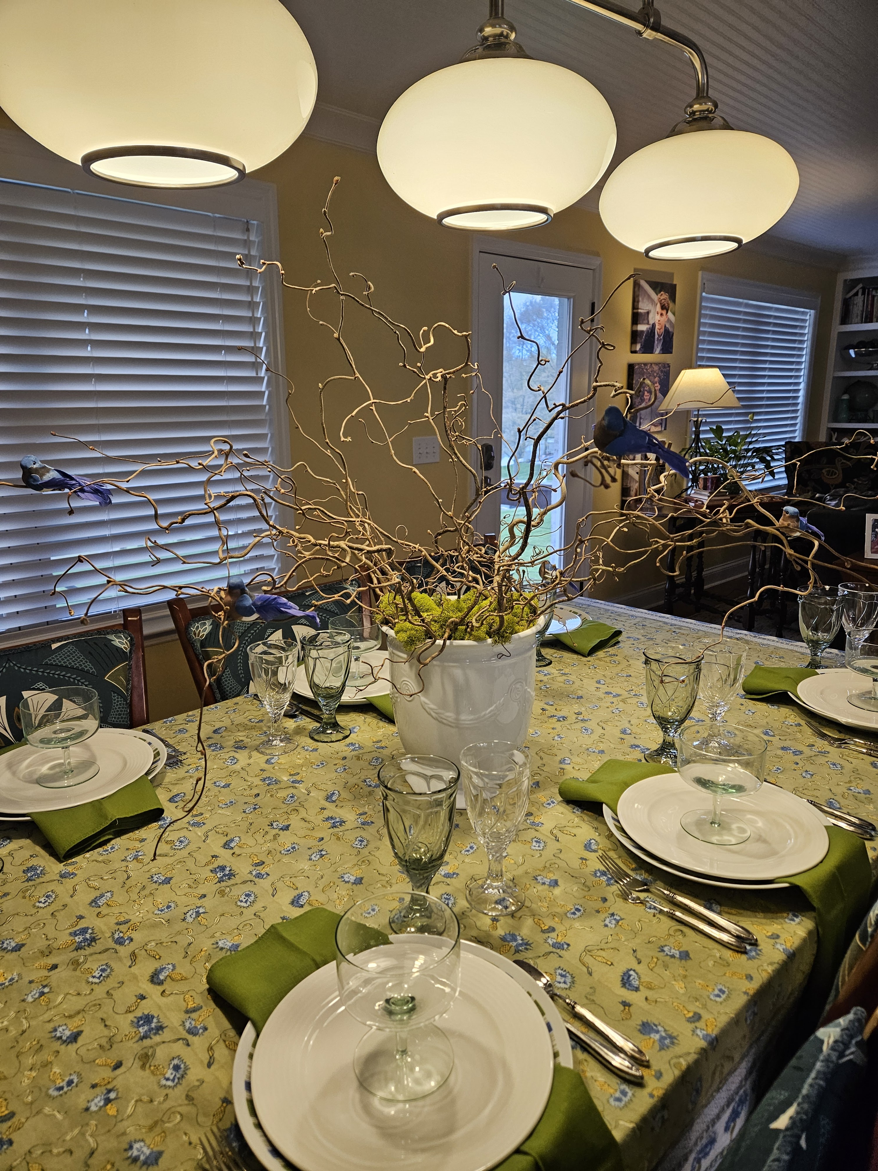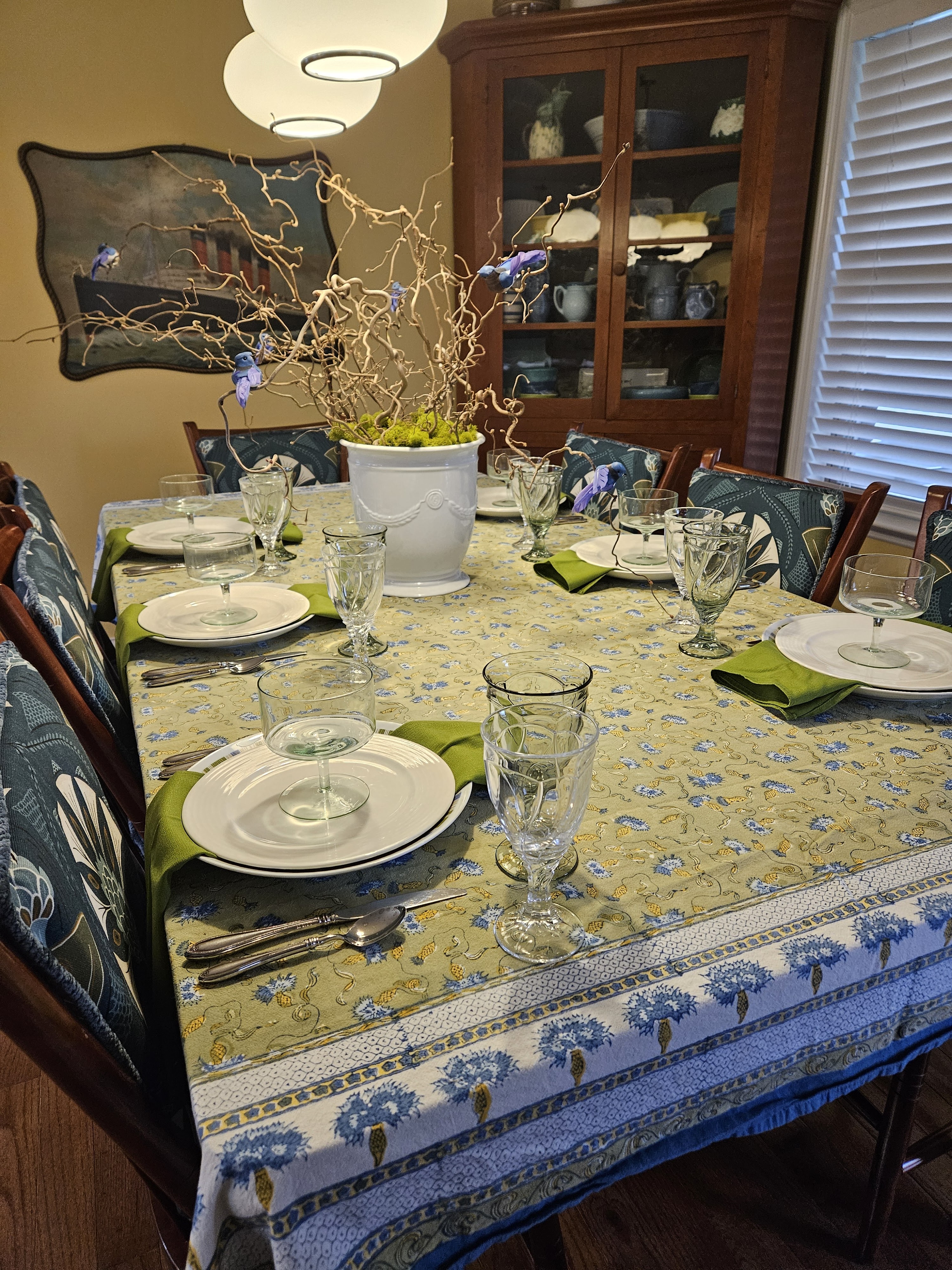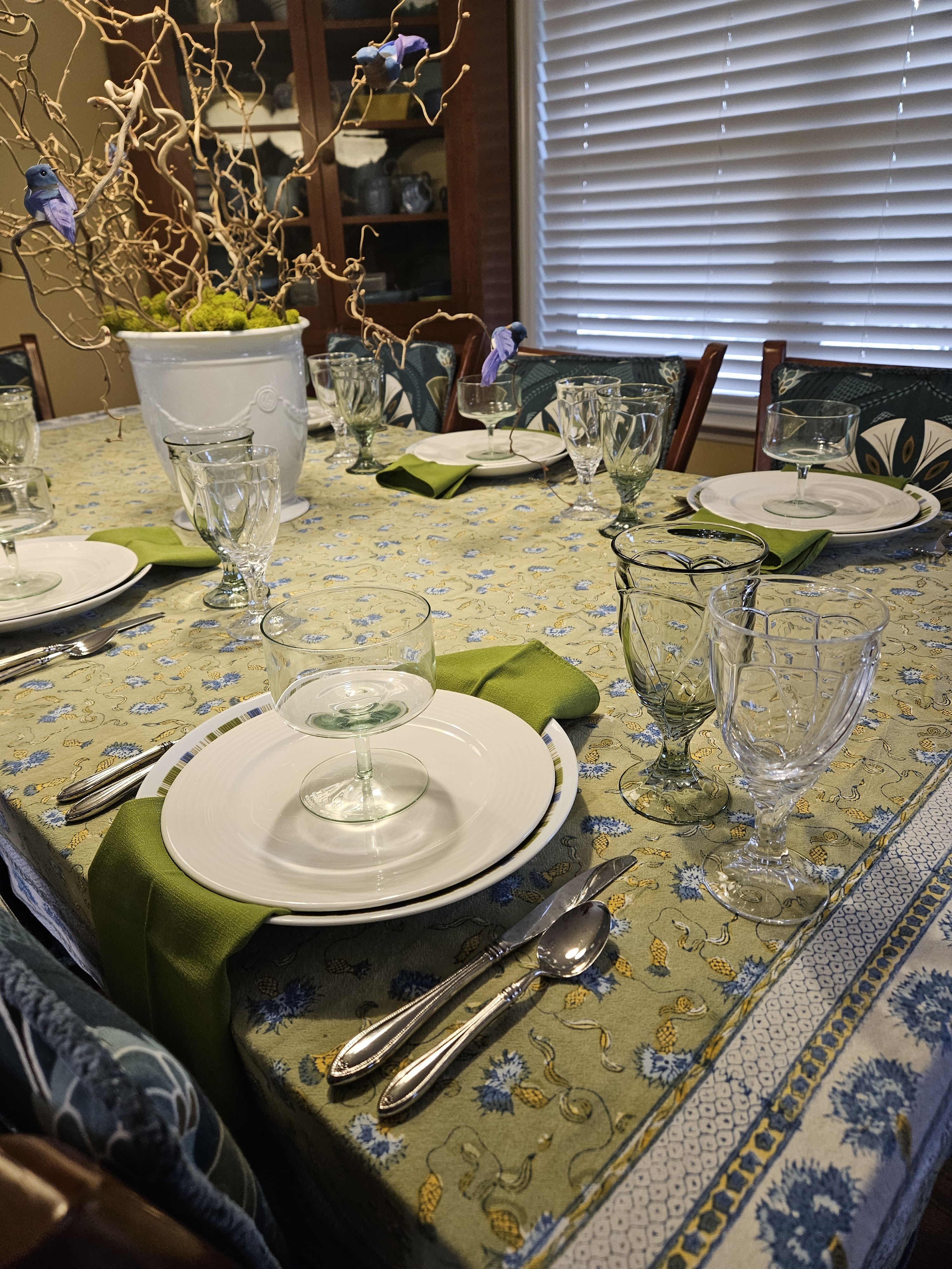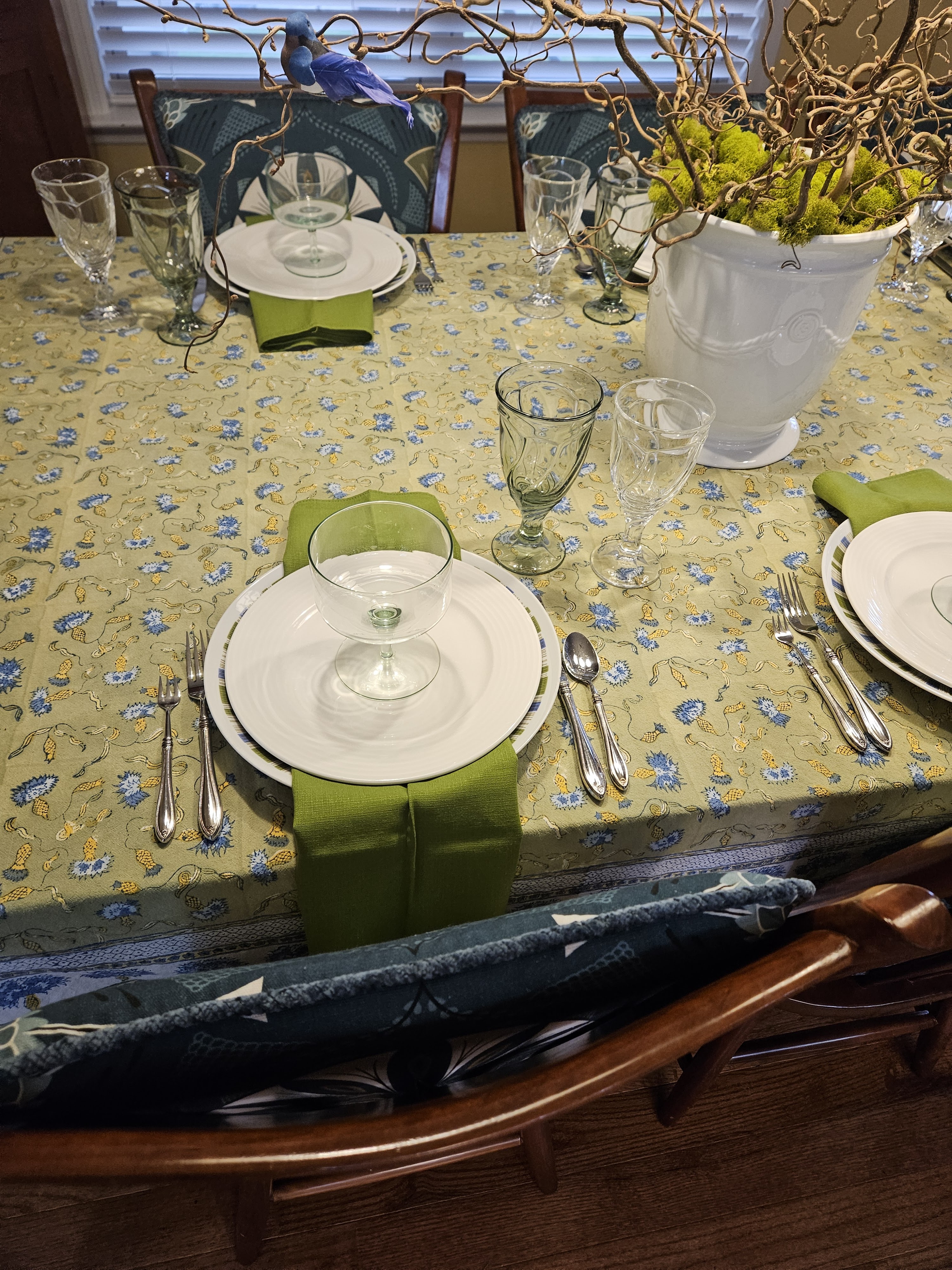 Anyway, the new cushions were the jumping off point for this table. I have a few tablecloths that work well with the color palette of the backs of the chairs and I used a green one with blues and yellows and whites in it. I have a huge container of curly filbert branches that I clipped faux blue birds onto and some preserved moss to hide the inside of the container.